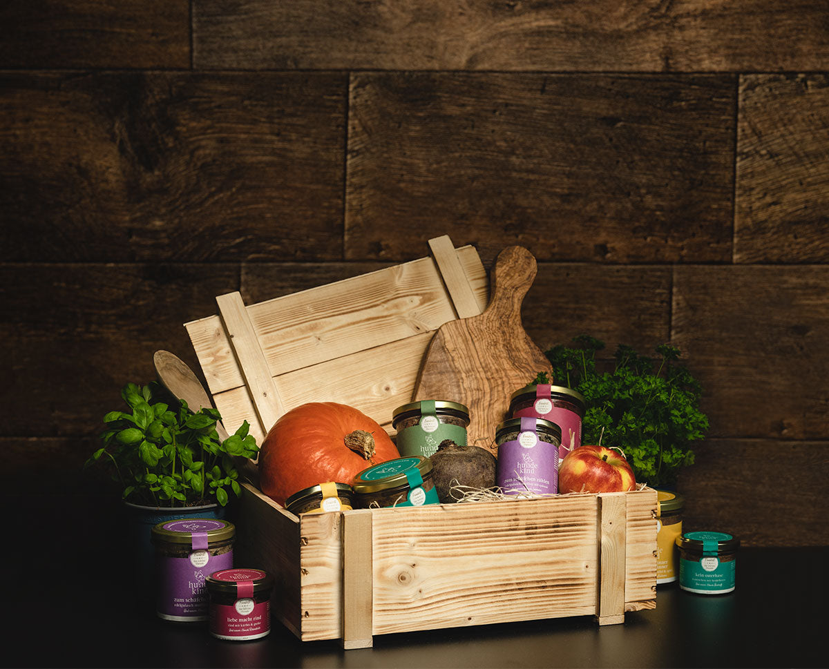 Unsere Feinkost ist individuell zubereitet und speziell auf den Bedarf kleiner Hunde bis zu 15kg Körpergewicht ausgerichtet. Kleine Hunde weisen eine verhältnismäßig große Körperoberfläche auf und verbrauchen somit mehr Energie, z. B. durch Wärmeverlust. Daher haben wir Mahlzeiten entwickelt, die einen höheren Energiegehalt aufweisen. Sie sind feiner gewolft und enthalten viele Vitamine sowie wichtige Kräuter. Unser Fleisch hat Spitzenqualität und stammt von renommierten Metzgern und Fleischlieferanten aus München und Umgebung. Gemüse und Obst werden frisch vom Markt unmittelbar vor der Kochung eingekauft. Jedes Glas trägt ein kleines Highlight in sich.